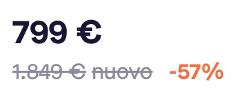 Il prezzo in nero situato a sinistra dell'immagine (799 € in questo caso) è il prezzo a cui vendiamo la bicicletta. La percentuale in arancione indica lo sconto di cui benefici rispetto al prezzo al pubblico consigliato. Lo sconto dipende da numerosi parametri, come il chilometraggio della bicicletta, l'anno, la richiesta dei clienti per quel modello, lo stato delle nostre scorte, ecc.