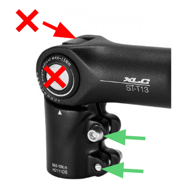 Alcune biciclette hanno attacchi manubrio più insoliti, mostrati di seguito. Per questi attacchi, assicurati di stringere solo le viti indicate in verde, senza toccare quelle indicate con le frecce rosse: