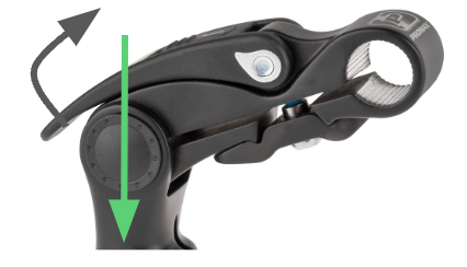 Vite verticale nascosta sotto una leva che si solleva a mano, facendo scorrere con il pollice un piccolo fermo sopra la leva.